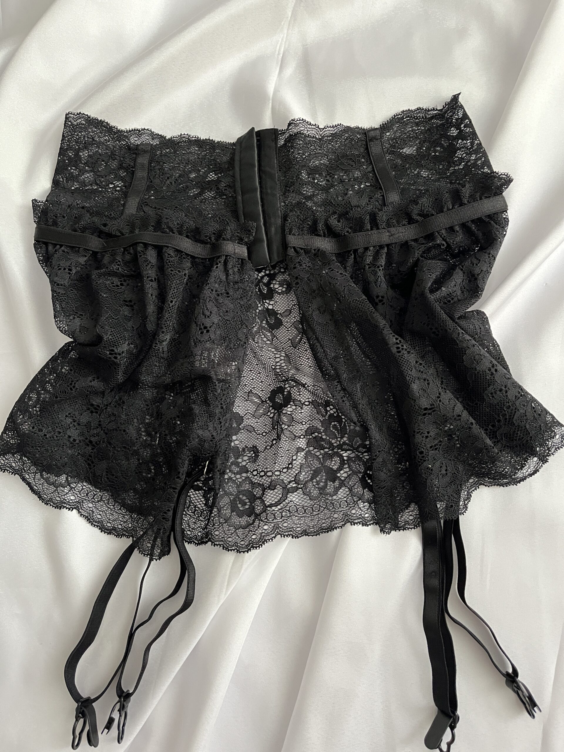 Siyahın gizemli cazibesiyle dantelin zarafetini bir araya getiren Black Reverie – Etekli Jartiyer Takım, feminen silueti kusursuz biçimde vurgular.