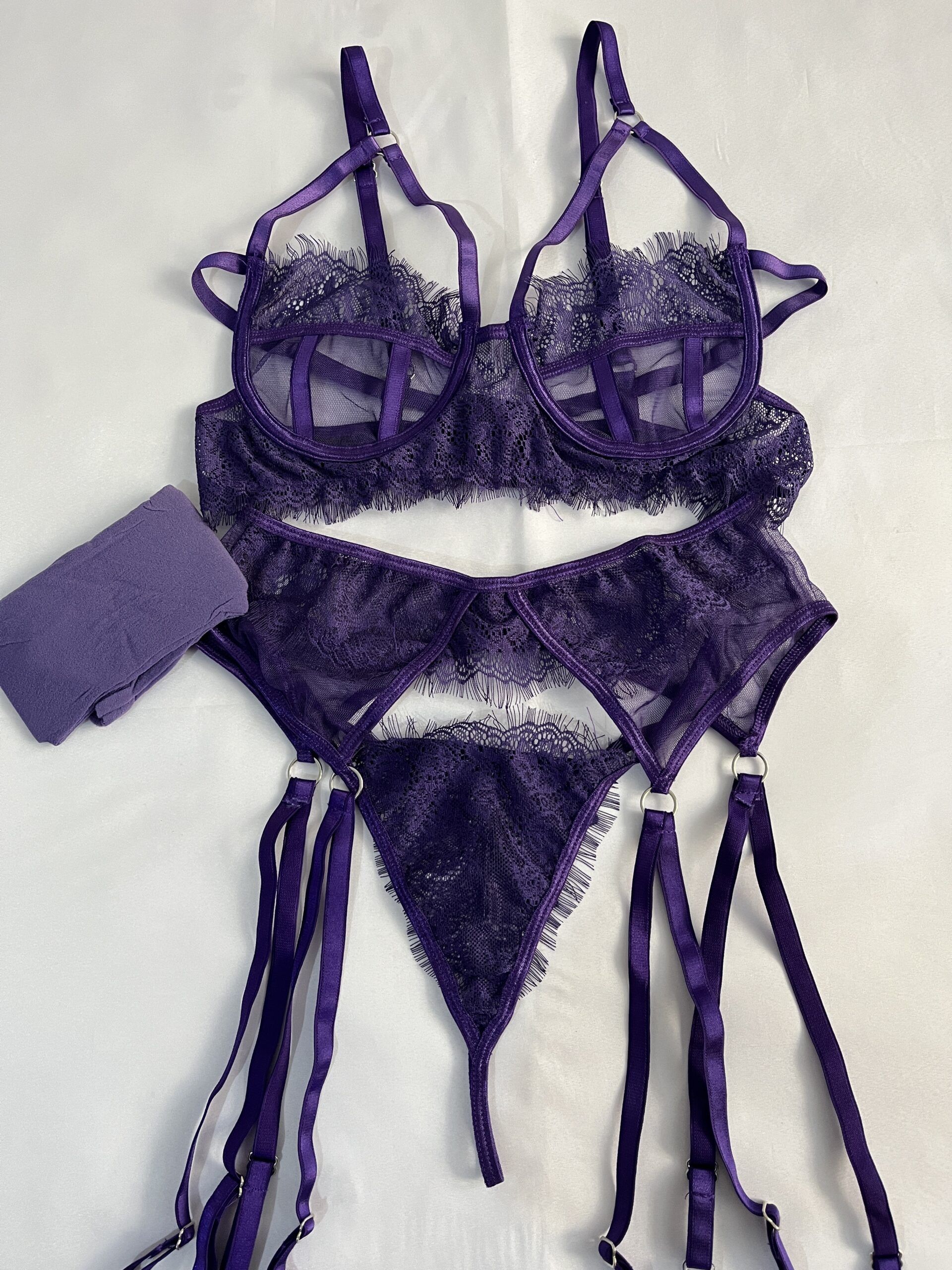 Cesur, etkileyici ve unutulmaz… Mor ikili jartiyer takımı, teninizde tutkunun rengini taşır. Dantel ve transparan detayların mükemmel uyumu, sizi baştan çıkarıcı bir şıklığa taşır. Her detayında özgüven, her dokunuşunda büyü var.